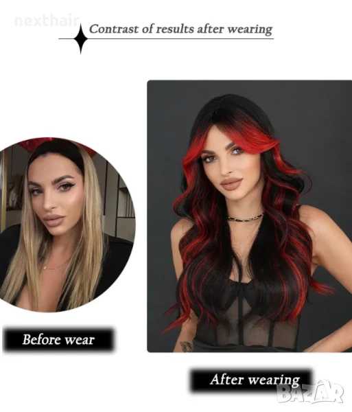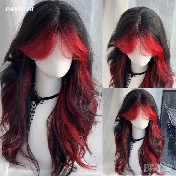 Ефектна омбре черна перука с червени кичури и краища → Обява 50561290