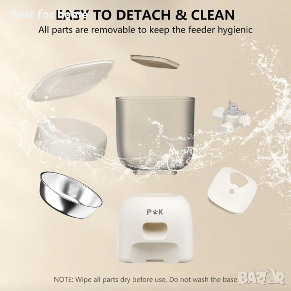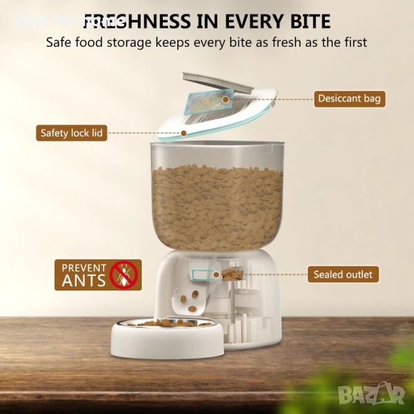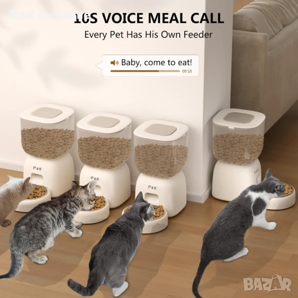 【10S Гласов запис】С нашия диспенсър за котешка храна можете да запишете 10-секундно съобщение, за да извикате домашния си любимец да яде и да му дадете познат глас, когато сте далеч от дома.