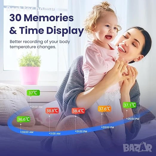 1. Неинвазивен: Няма контакт с тялото, което го прави удобен и хигиеничен. 2. Бърз и точен: Осигурява отчитания в рамките на секунди. 3. Лесен за употреба: Повечето модели разполагат с прости бутони и ясни инструкции. 4. Безопасен за всички възрасти: Идеален за бебета, деца и възрастни, може да се настрои за три различни възрастови групи. 5. Бързи отчитания: Намалява времето, прекарано в чакане на резултати. 6. Bluetooth функция (по избор).