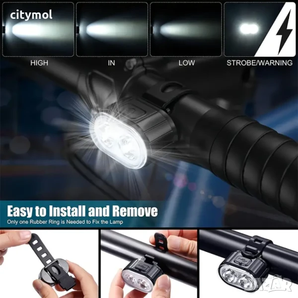 Белият фар има 4 режима на светене: висока яркост, средна яркост, ниска яркост и светкавица (Активира се с двойно натискане на бутона). Червения стоп има 6 режима на светене: висока/средна/ниска яркост, бавна светкавица, мигаща светкавица и бърза светкавица. Всички предни и задни светлини имат функция за памет на режима, щракнете, за да промените режима на осветяване. БЪРЗО ЗАРЕЖДАНЕ чрез USB: в предните светлини е вградена литиева батерия 800 mA, а в задните светлини е вградена литиева батерия 540 mA. Пълното зареждане отнема само един час. Устройството има скрити USB портове за зареждане, които позволяват бързо зареждане чрез свързване към компютъра и други устройства през USB порта, избягвайки ненужната смяна на батерията.
