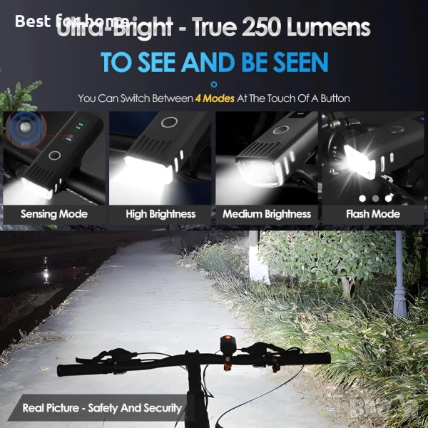 【4 режима, свободно превключване】Използвайте нашите презареждащи се предни и задни велосипедни светлини, за да карате безопасно през нощта. 250 лумена, върховно изживяване. Осигуряват ви по-добро нощно виждане. Фарът предлага 4 регулируеми режима на осветление (интелигентен режим на разпознаване, силна светлина, слаба светлина, режим на мигане). Подаряваме и задни светлини за вашата безопасност на пътя.