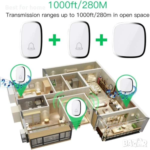 Водоустойчив безжичен звънец: градинският звънец е изработен от висококачествен водоустойчив материал IP44. Работи между -30°C и 70°C, което го прави подходящ за употреба на открито. Например, при дъжд и сняг, радио звънецът за входна врата може да издържи добре.