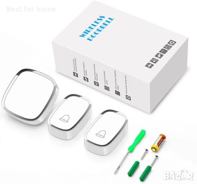 2 предавателя и 1 приемник: Безжичният комплект звънец Charlemain използва независима система за цифрови кодове, което ви спестява притесненията за евентуални смущения един от друг със системата на вашите съседи. Ще получите 2 предавателя, 1 приемник, винтове, тиксо, мини отвертка.