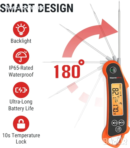 Функции, богати на стойност: Отчитайте измерванията безопасно далеч от топлина с функцията за заключване на температурата; поддържайте точността на този дигитален термометър за храна чрез потребителско калибриране; измивайте под течаща вода благодарение на водоустойчивия му дизайн със сертификат IP65.