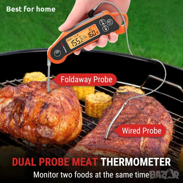 Термометър за месо с незабавно отчитане, дигитален за готвене, водоустойчив кухненски термометър 2 в 1 с двойни сонди и двоен температурен дисплей за фурна, грил, пушилня и барбекю.