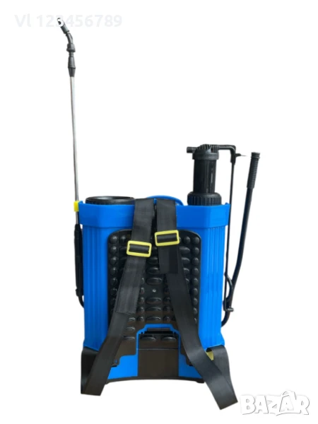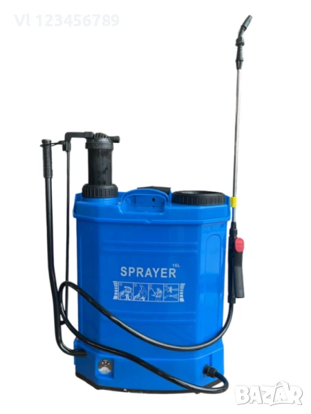 - Пръскачката използва оловен акумулатор с гел и миниатюрен електродвигател, задвижващ помпата, която създава налягането.