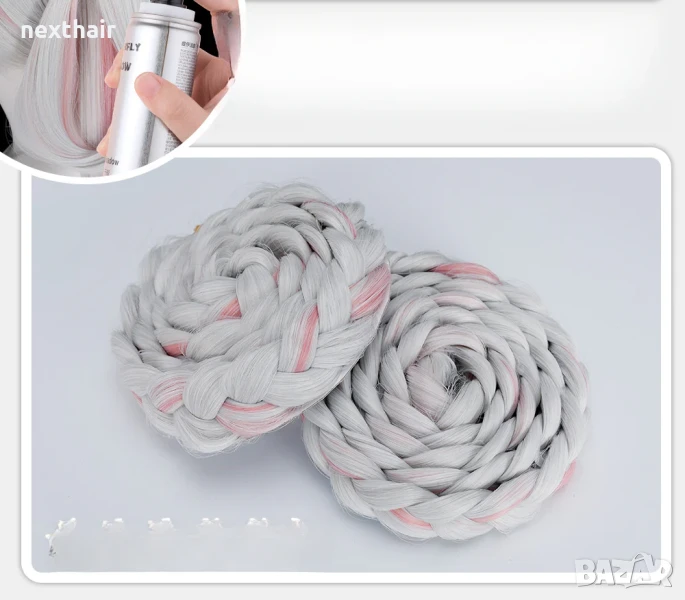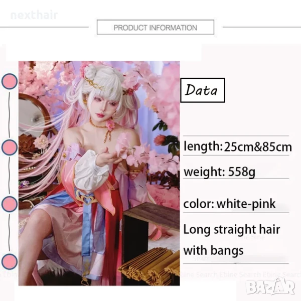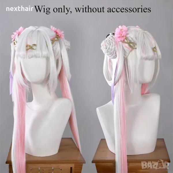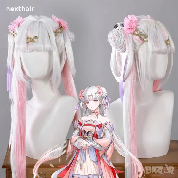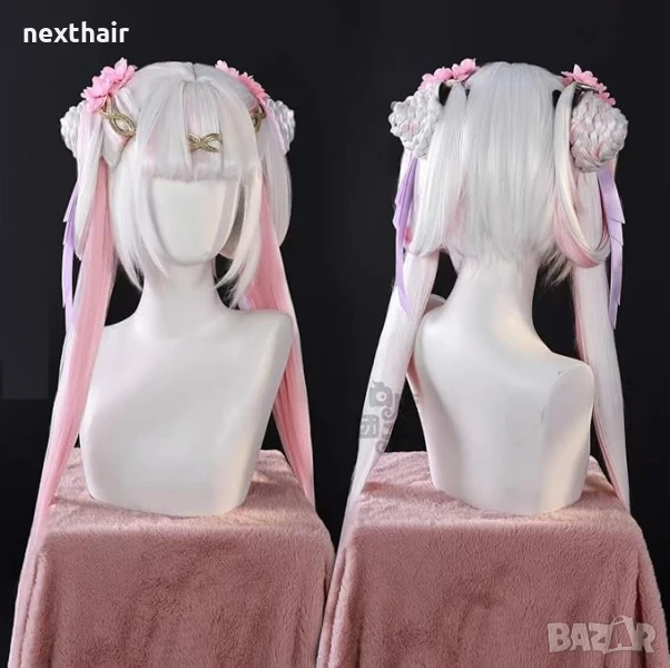 Висококачествена аниме перука бяло и розово с подвижни опашки → Обява 50567085