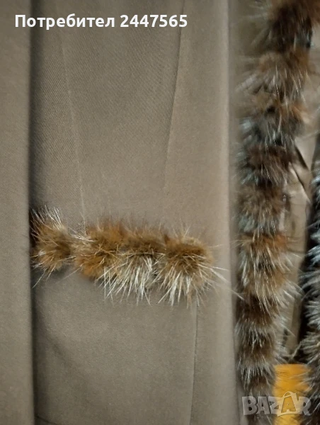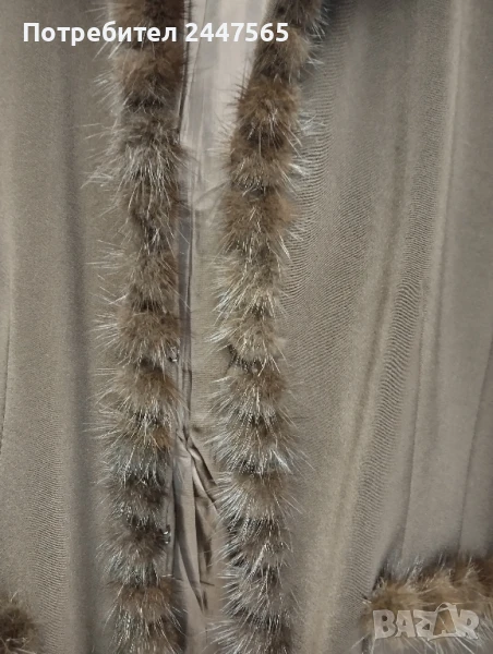 Елегантно дамско сако размер S ,M (42). Производство Италия, цвят кафяв, полиестер, има хастар, два странични джоба, яка "стойка ", добро състояние . Размери : дължина 55см,дълж. ръкав 63см, гръдна обиколка 94см, ширина рамене 41см, ширина яка със норка 5,5см.Сакото украсено със натурална кожа норка във вид на топчета, закопчава се със 2 кукички.