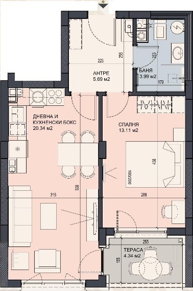ЕЛЕГАНС ЕСТЕЙТ Ви представя двустаен апартамент с чиста площ от 62 кв.м в новострояща се красива сграда, разположена на изключително комуникативно място. Жилището се състои от входно антре, просторна дневна с трапезария и кухненски бокс, спалня с обща прилежаща тераса, баня с тоалетна.