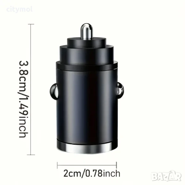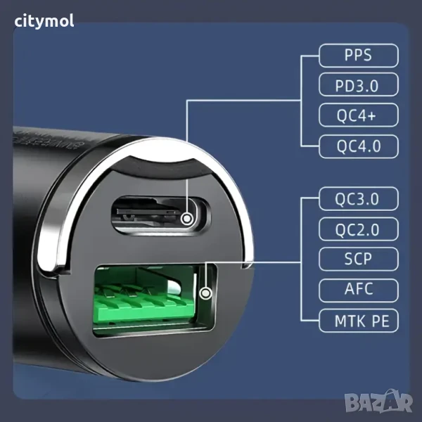 Ултра мини зарядно за кола, FAST Cahrging, 2 порта - USB-C PD / USB-A QC 3.0