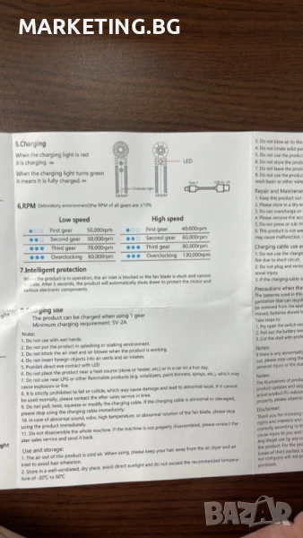 Мощност на двигателя: 130000 RPM (оборота в минута), осигуряващ силен въздушен поток;