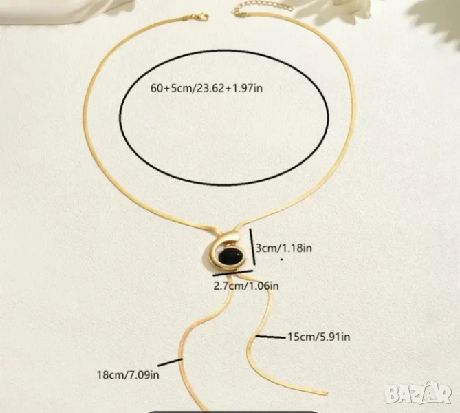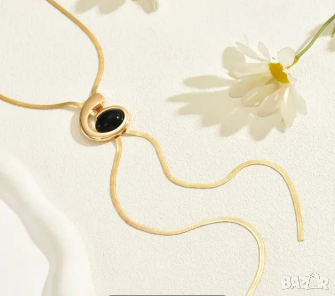 Елегантна златиста Y-образна огърлица за жени с черен овален акрилен медальон.