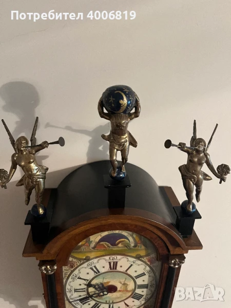 Фигурки: В горната част са разположени три месингови фигурки, които са характерен декоративен елемент за тези часовници.