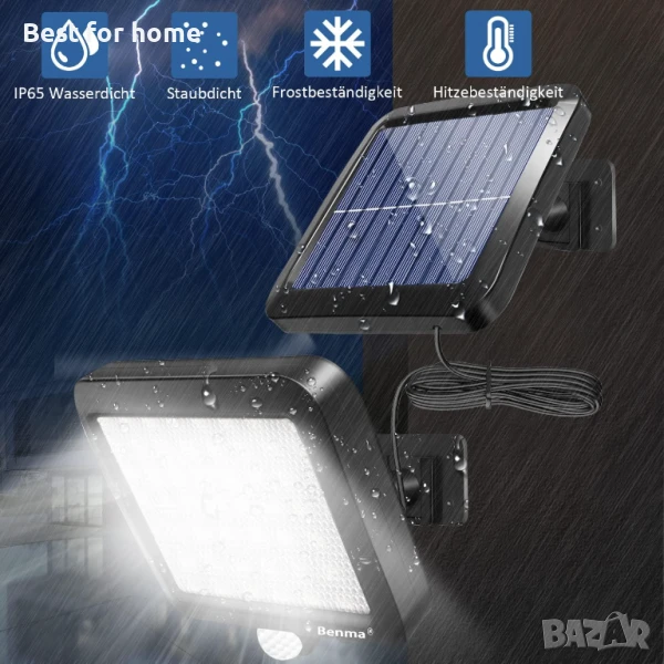 Соларни лампи BENMA за открито, 56 светодиода, слънчеви лампи, 120° супер ярка слънчева стенна лампа със сензор за движение, IP65 водоустойчива градинска стенна лампа за сигурност с 5 м кабел.