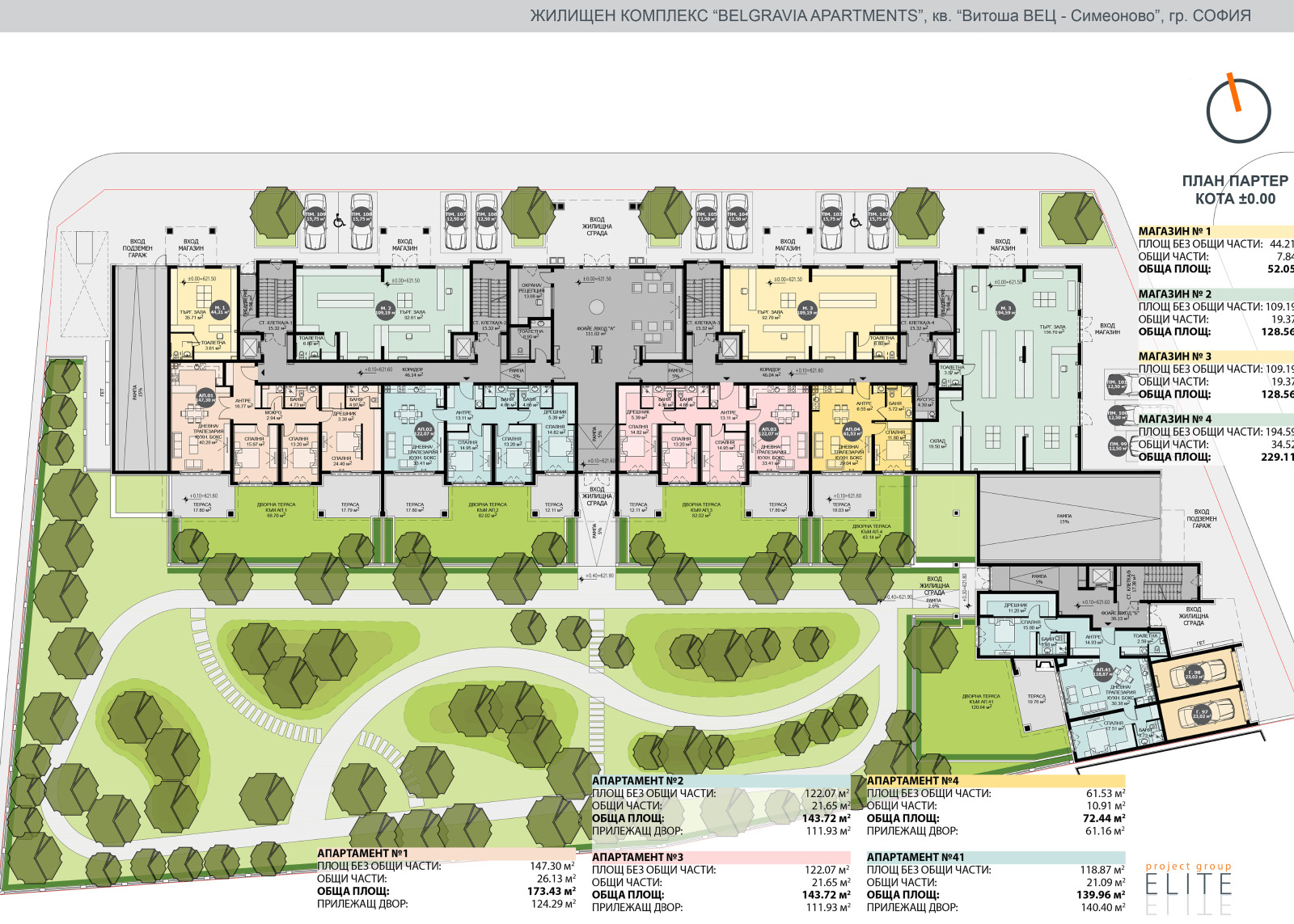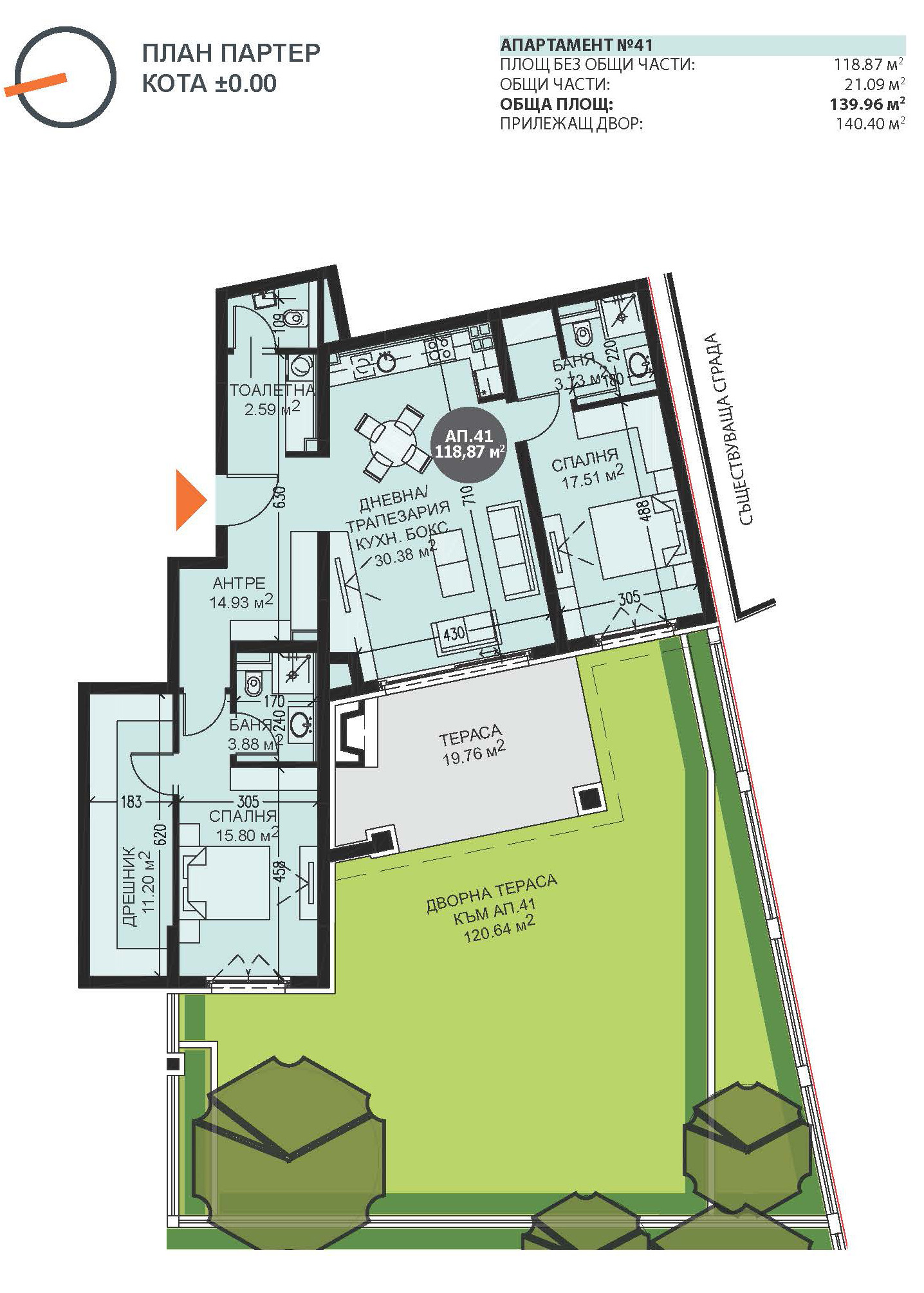 Тристаен апартамент 41, разположен на партерен етаж, вход Б. Изложение: запад. Разпределение: антре, дневна с кухненски бокс и трапезария, две спални със самостоятелни бани и дрешници, тоалетна за гости. Излаз на тераса и самостоятелен озеленен двор. Светла височина 3.15 м. Чиста площ 118,87 м² + 21,09 м² общи части (15 %) + 19,76 м² тераси + 120,64 м² двор. Три вида схеми на плащане с възможност за отстъпки от стойността на апартамента! 100% подсигурено банково финансиране за изграждането на проекта!