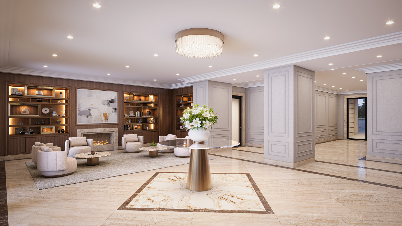Общи части: Луксозно изпълнение с настилки от естествен камък мрамор Dyno, стени облицовани с винилови тапети Vescom и тавани с корнизи със скрито осветление. За входните лобита са предвидени настилки от екзотичен естествен мрамор, облицовки от HPL ламперии, напълно оборудван и обзаведен кът за отдих и срещи с камина и мека мебел.