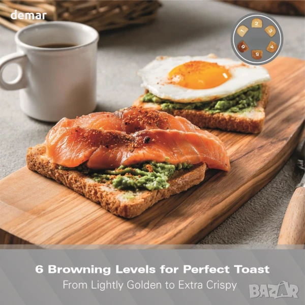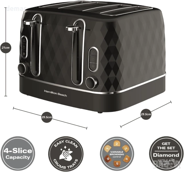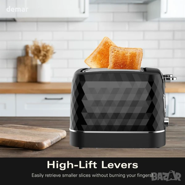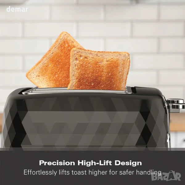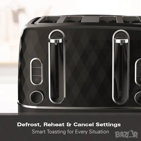 Този тостер е с капацитет за 4 филийки, идеален за натоварени сутрини или семейна употреба, и съчетава стилен дизайн с ромбовидна текстура с хромирани акценти, за да подобри всяка кухня. Той включва функция за високо повдигане за по-безопасно изваждане на препечения хляб, както и опции за размразяване, претопляне и отмяна за допълнителна гъвкавост. Подвижната тава за трохи осигурява лесно и безпроблемно почистване.