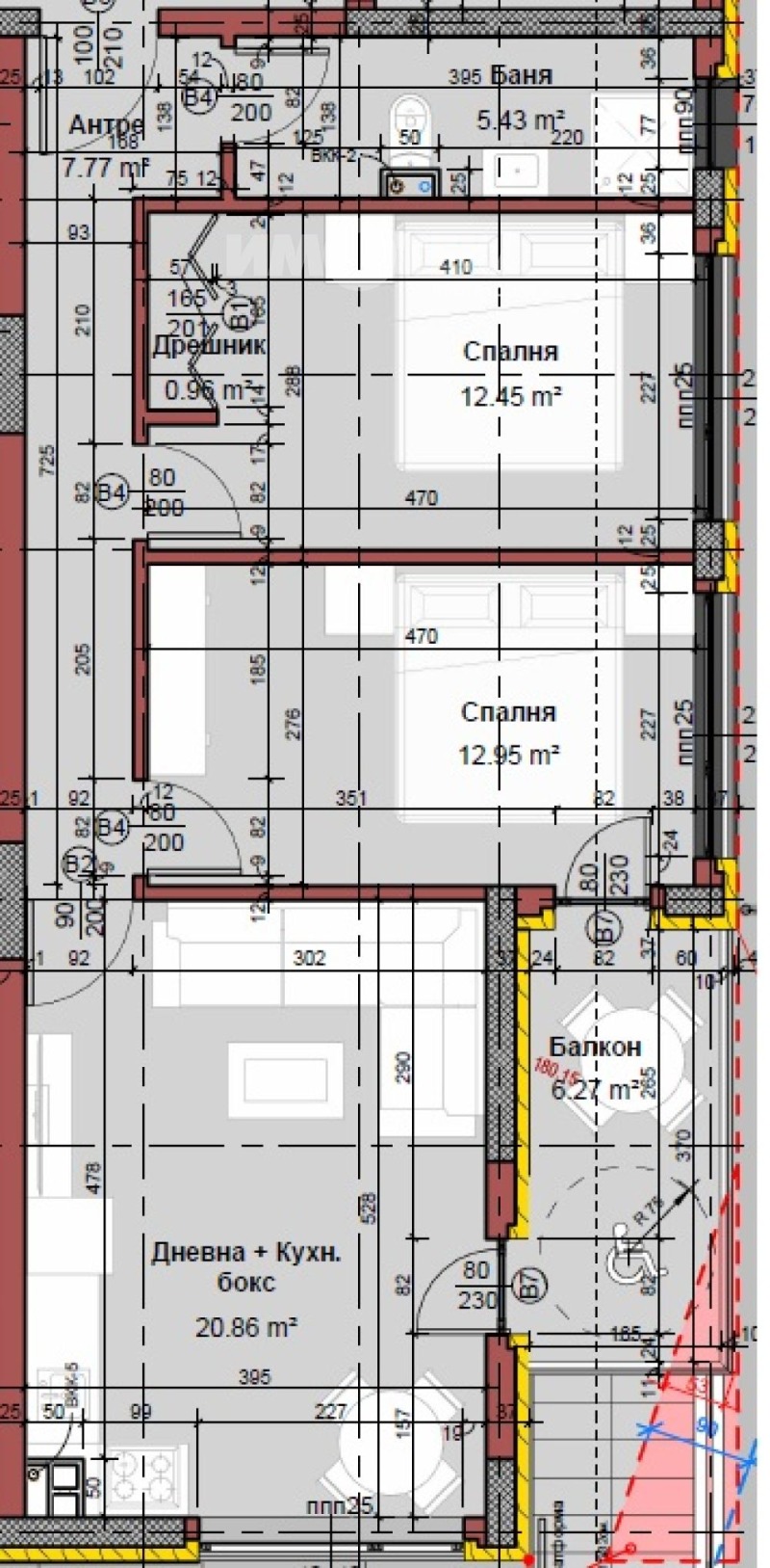 Разпределение: дневна с кухненски бокс, две спални, баня с тоалетна, входно антре и тераса