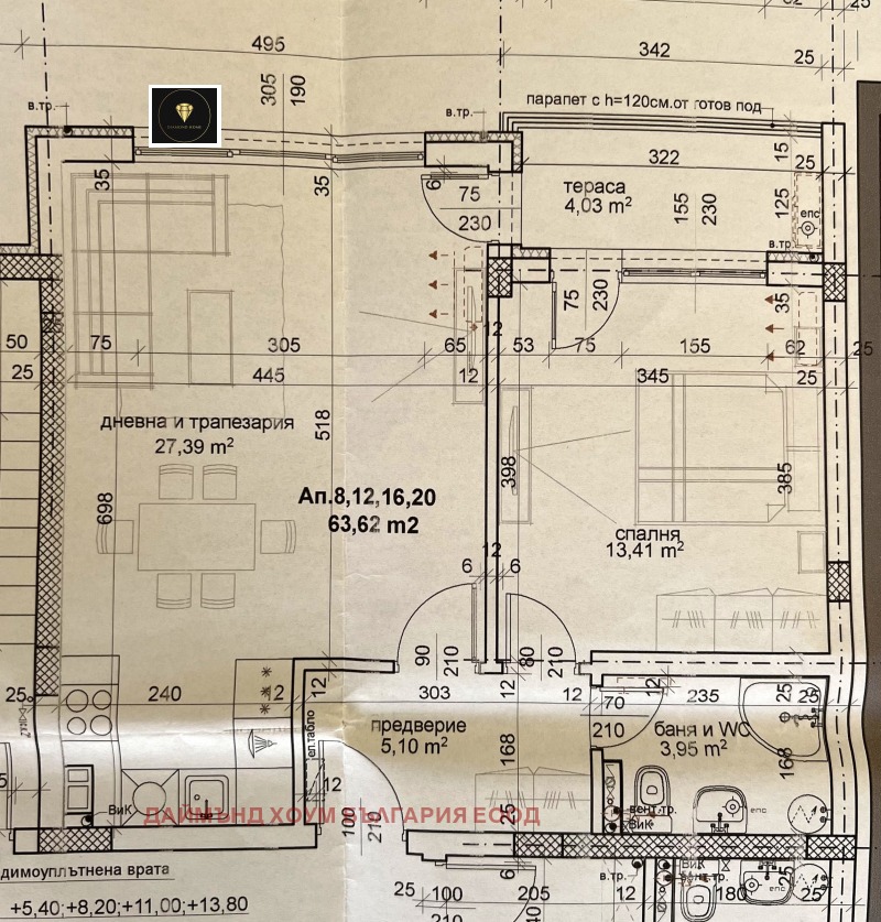 - 📐разпределение: Хол с кухненски кът, спалня, баня с тоалетна, входно антре и тераса.