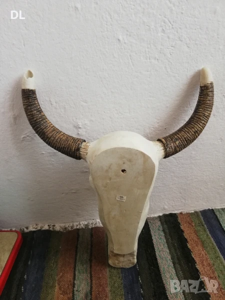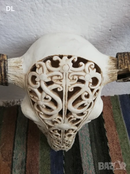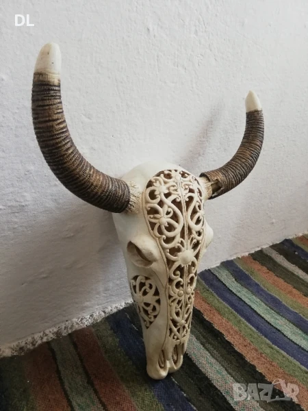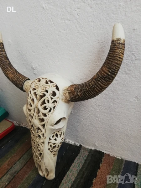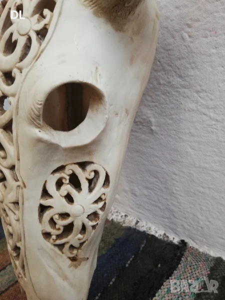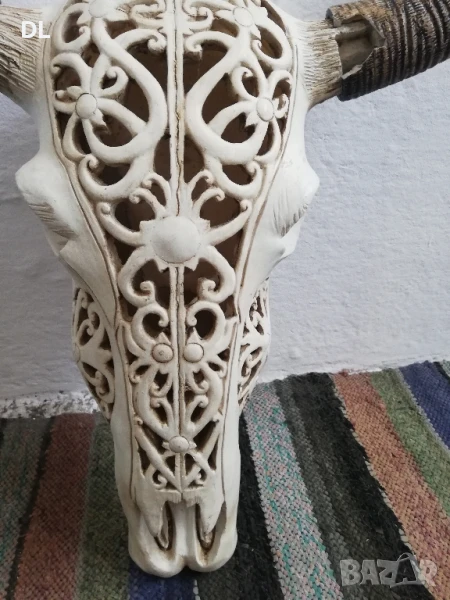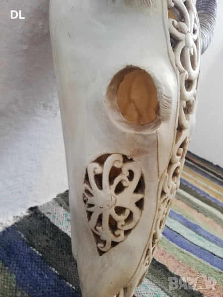 ЛИЧНО ПРЕДАВАНЕ. Продавам резбован череп. Рогата се разглобяват. Левия рог има 2 липащи парчета. ВИСОЧИНА 61 СМ. ШИРИНА ГОРЕ В РОГАТА 48 см.
