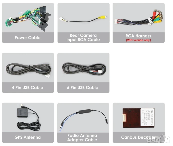 Пълен комплект с цялата рамка, преходни кабели и букси, декодери, предназначени и съвместими за монтиране на конкретния модел автомобил.