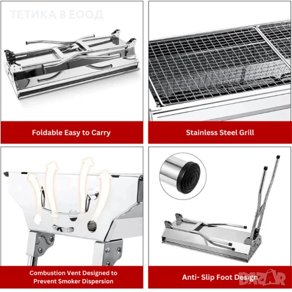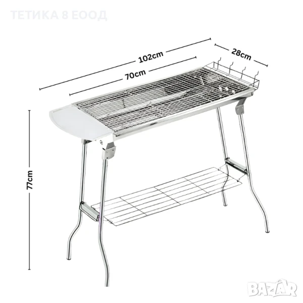 С отвори за горене за оптимален поток на кислород и равномерно разпределение на топлината, този грил е идеален за разнообразие от храни, от апетитни бургери до сочни кебапчета и пикантни пържоли. Просторната зона за готвене и двойните кошници за подправки го правят идеален избор за семейни събирания на открито. Изработен с мисъл за дълготрайност, устойчивата на ръжда неръждаема стомана осигурява издръжливост и лесна поддръжка, докато сгъваемият и разглобяем дизайн осигурява незабавна употреба.