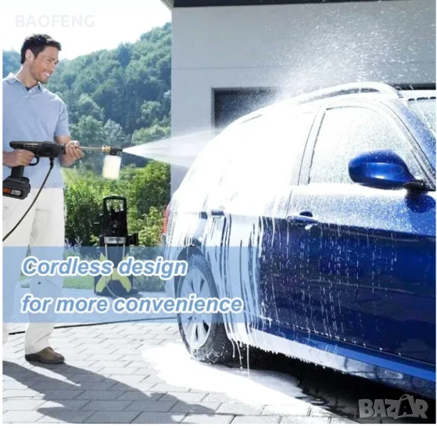 [Преносим безкабелен без необходимост от вода под налягане]: Устройството за миене под налягане, захранвано от батерии, разполага с безжичен дизайн, който премахва кабелите и нуждата от вода под налягане (просто потапяте маркучът в кофа,шише или дори езерото). Сглобяването отнема само минутa, а батерията с голям капацитет осигурява висока мощност на пръскане .