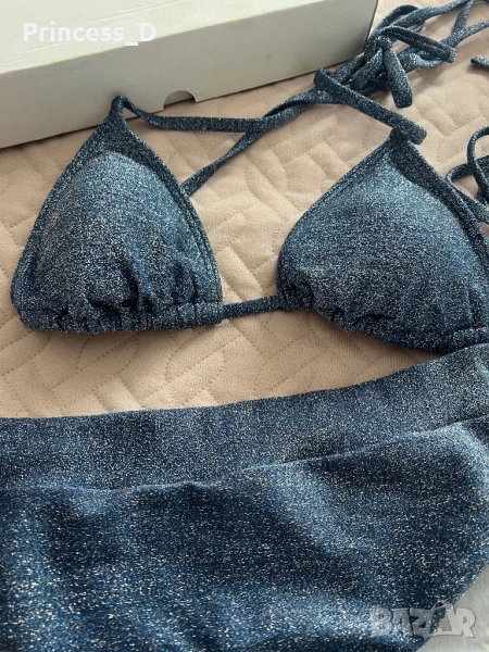 Материя с блестящ ефект и втъкани нишки от ламе. Горнище в М размер с регулиращи връзки и свалящи се подплънки и долнище в С размер с висока талия. Изключително запазен!