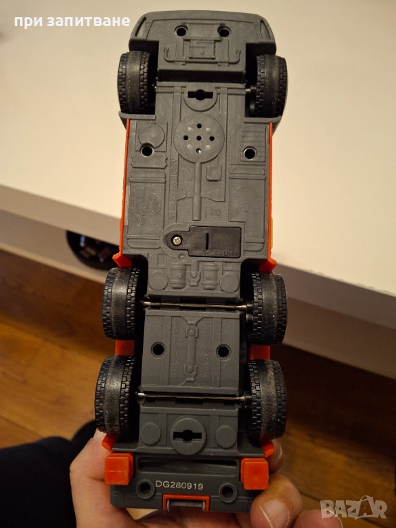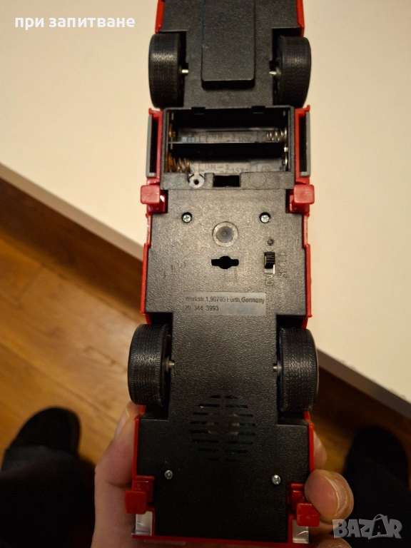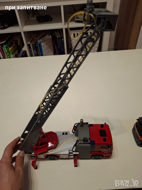 - Голямата пожарна Man е с размери 30/ 13/7 см. без разгъната или вдигната стълба. С разгъната стълба- 50 см. дължина. Има помпа и маркуч да пръска вода, светят сирени и фарове, издава зуци. Предни колела - с механизъм. Липсва капачето за батериите. Работи с 2 батерии 1,5 V AA стандартните. Цена- 13 евро.