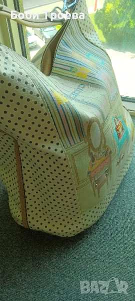 Дамска чанта висококачествена еко кожа в прекрасна цветова комбинация при лицевата част и полиестерен хастар. Налице са три самостоятелни прегради, като средната от тях се закопчава с цип, а другите две с джобове за мобилен телефон и лични документи. Чантата разполага освен с къса дръжки, така и с дълга саморегулираща се такава.
