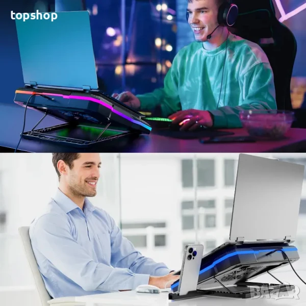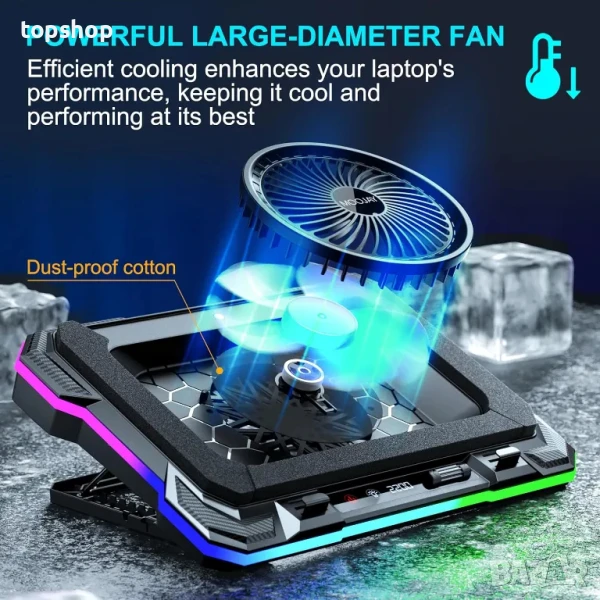 НОВА, ТЕСТВАНА охлаждаща подложка за лаптоп Moojay C51, мощен турбо вентилатор с RGB, 8 регулируеми височини и държач за телефон, за лаптопи 14-19 инча - ледено синя LED светлина
