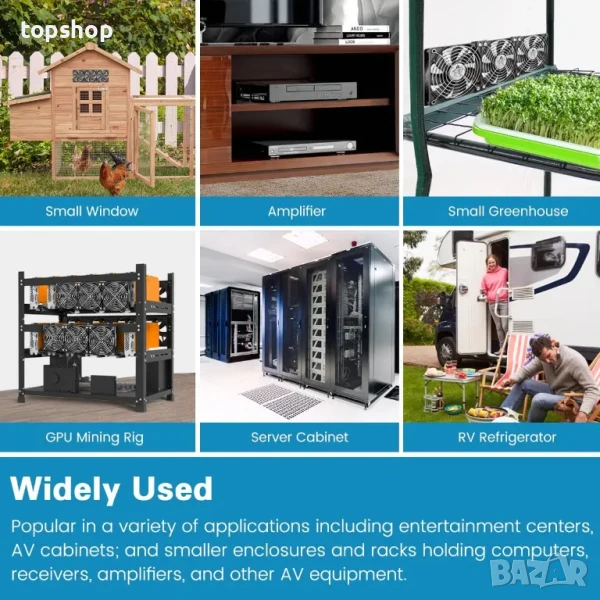 Лесен за работа вентилатор: Този вентилатор за шкаф може да се използва като малък вентилатор за прозорец за изсмукване и засмукване; Повишена циркулация на въздуха в подпокривно пространство, мазе, таванско помещение и гараж; или като вентилатори за изпускане на парни вентилатори за затворени сървърни шкафове, проект „Направи си сам“ за медийни стелажи, малък кът за пушене, геймърски шкаф
