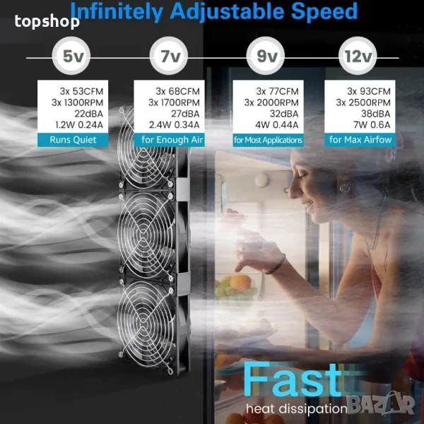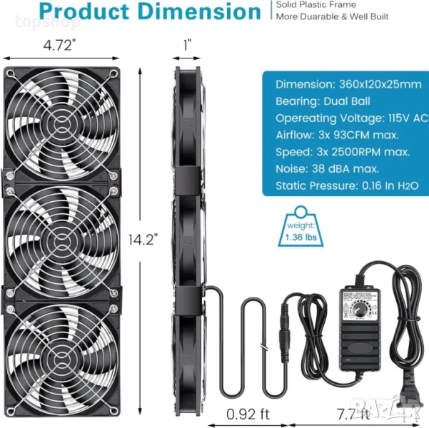 360 мм вентилатор за сървър: Общ размер: 14,2 x 4,72 x 1 инча; Въздушен поток: 279CFM (3x 93CFM); Този 3x 120 мм компютърен вентилатор с AC щепсел е предназначен за вентилация на шкаф за отглеждане на растения; Циркулира въздуха, за да помогне за охлаждането на хладилника на кемпер; Пренася топлина/охлаждане в помещенията; Изпуска изгорели газове/миризми при 3D печат/аерограф/заваряване; Охлажда компютърни кули, сървъри, компютри, модеми, лаптопи, приемници, AV шкафове
