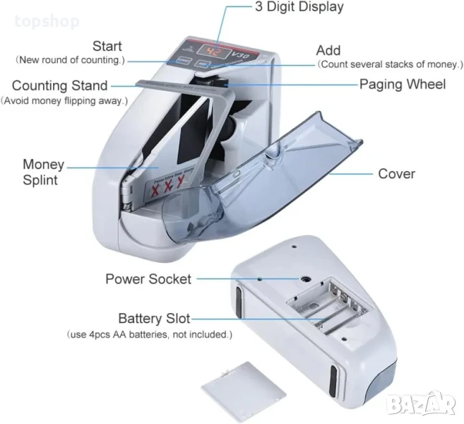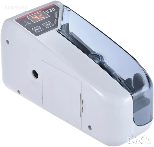 Удобен брояч на банкноти, бърза скорост, висок капацитет на броене, с 3-цифрен дисплей. Захранва се с батерии или захранващ кабел, може да се използва както на закрито, така и на открито. Лесен за употреба, спестява време и разходи за труд.