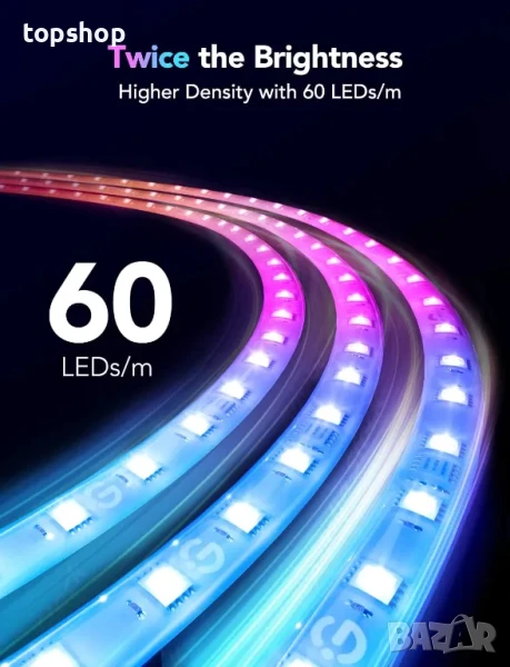 По-ярка от всякога: С 60 светодиода/м², Govee M1 има по-висока плътност от повечето RGBIC LED ленти. LED лентите Govee M1 осигуряват два пъти по-голяма яркост в лумена от по-старите поколения, за по-силна и по-последователна атмосфера в декора на стаята.