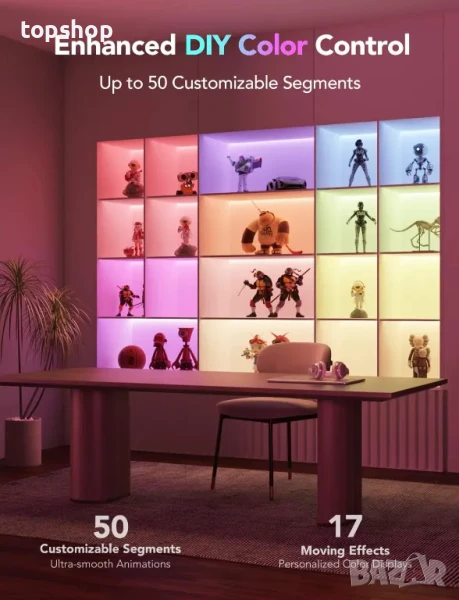 Повече забавление „Направи си сам“: Режимът „Направи си сам“ на приложението Govee Home позволява управление на 50 персонализируеми сегмента на LED лентите Govee за персонализирани цветни дисплеи и ултраплавни светлинни ефекти, плюс 17 анимационни ефекта, за да развихрите креативността си.