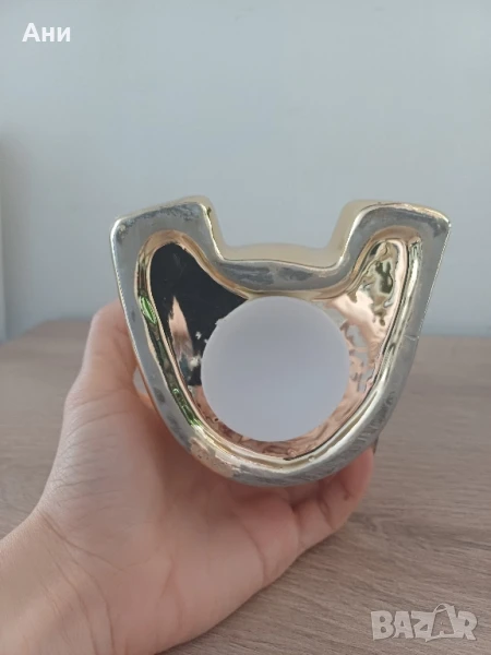 Златиста касичка във формата на мече, изработена от керамика с огледално метално покритие, което ѝ придава луксозен и модерен вид. Идеална е както за детска стая, така и за декорация в дома или офиса. Може да се използва за събиране на монети или просто като акцент в интериора.