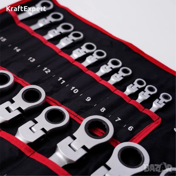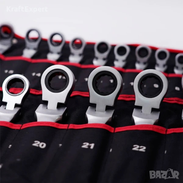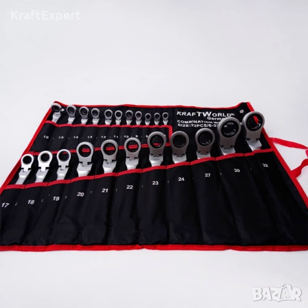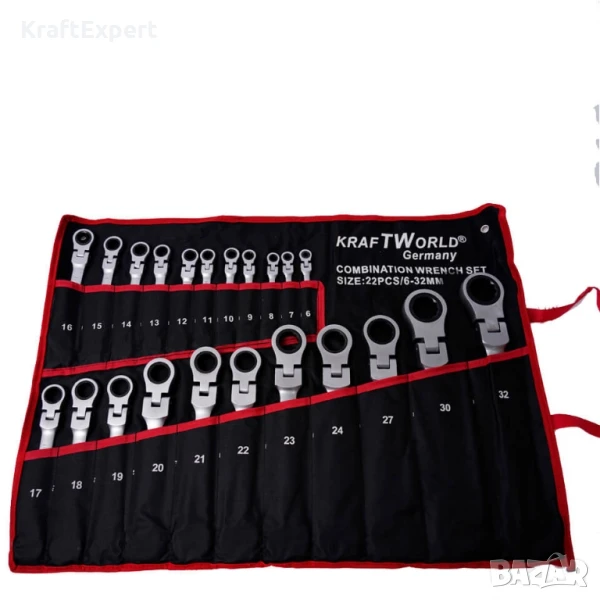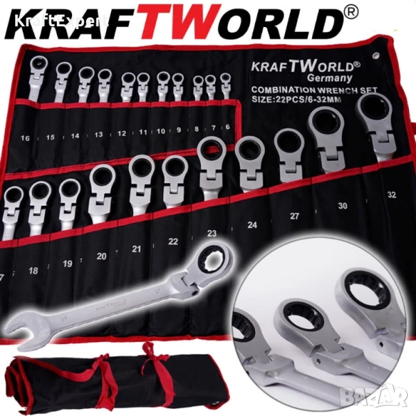 Внесете професионализъм във всяка ремонтна дейност с пълния комплект тресчотни ключове от KraftWorld – 22 части, от 6 до 32 мм, с уникално чупещо рамо за максимална гъвкавост и достъп до труднодостъпни места. Изработени от висококачествена Cr-V хром-ванадиева стомана, тези ключове гарантират здравина, устойчивост на корозия и дълготрайност дори при интензивна употреба.Снабден с 72-зъбна тресчотка, комплектът осигурява прецизност и ефективност, което го прави перфектен за професионални механици и домашни майстори. Комплектът идва в удобен калъф, който може да бъде сгънат или закачен на стена за по-добра организация. Изберете KraftWorld – качеството, което заслужавате!