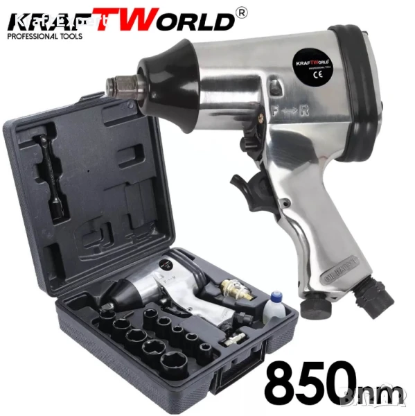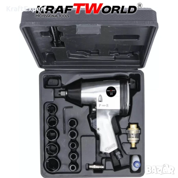 Комплектът KraftWorld предлага идеалното решение за всички автосервизи и домашни гаражи. Той включва хидравличен крик тип крокодил с товароносимост 2.5 тона и пневматичен гайковерт с 850 Nm въртящ момент, предоставяйки нужната стабилност и мощност за бързо и лесно повдигане и поддръжка на автомобили.Хидравличен крик тип крокодил KraftWorld 2.5TТози хидравличен крик тип крокодил е идеален за повдигане на автомобили като джипове, бусове и ванове. С товароносимост до 2.5 тона и обхват на повдигане от 140 мм до 387 мм, крикът предлага сигурност и ефективност. Изработен от здрави стоманени материали, оборудван със стоманени колела и удобна дръжка за лесно местене, той е перфектен за всеки гараж.Товароносимост: 2.5 тонаМинимална височина: 140 ммМаксимална височина: 387 ммСтоманени колела и дръжка за пренасянеИздръжлива конструкция за продължителна работаПневматичен гайковерт KraftWorld 850 NmВключеният пневматичен гайковерт е компактен, но изключително мощен, с максимален въртящ момент от 850 Nm и скорост до 6700 об./мин. Той е перфектен за затягане и разхлабване на гайки и болтове в тежки условия. Гайковертът е съпроводен с практичен пластмасов куфар, който съдържа 17 части, включително различни накрайници и аксесоари за пълно удобство и лесно съхранение.Максимален въртящ момент: 850 NmСвободна скорост: 6700 об./минКвадратна предавка: 1/2″Средна консумация на въздух: 5 cfmКомплектът включва:10 шестограми (9 мм до 27 мм)Удължител, мини мазач, шестограмен ключ и инструмент за маслоСъдържание на комплекта:1 x Хидравличен крик тип крокодил KraftWorld 2.5T1 x Пневматичен гайковерт KraftWorld 850 Nm10 x Шестограм 9 мм до 27 мм1 x Удължител1 x Mini мазач1 x Шестограмен ключ 4 мм1 x Цев и инструмент масло1 x Пластмасов куфар за гайковерта