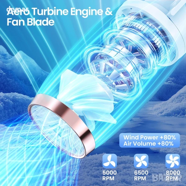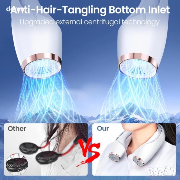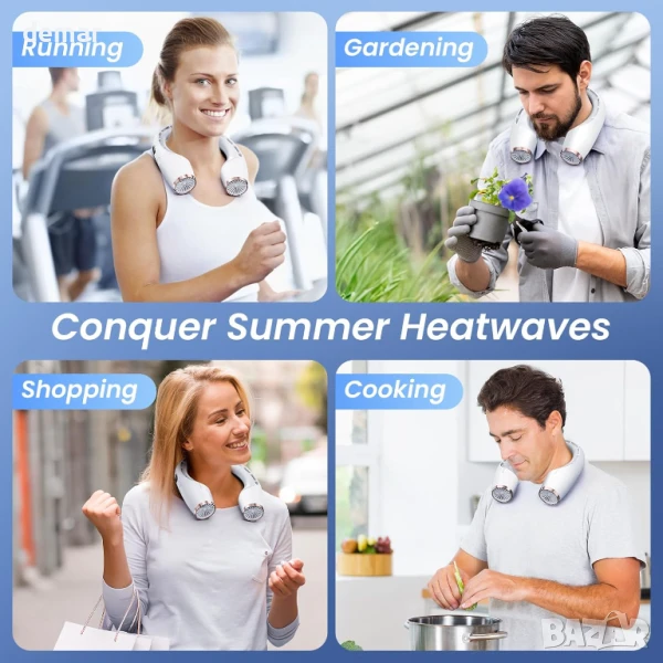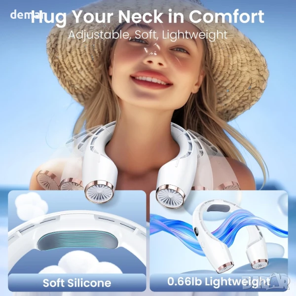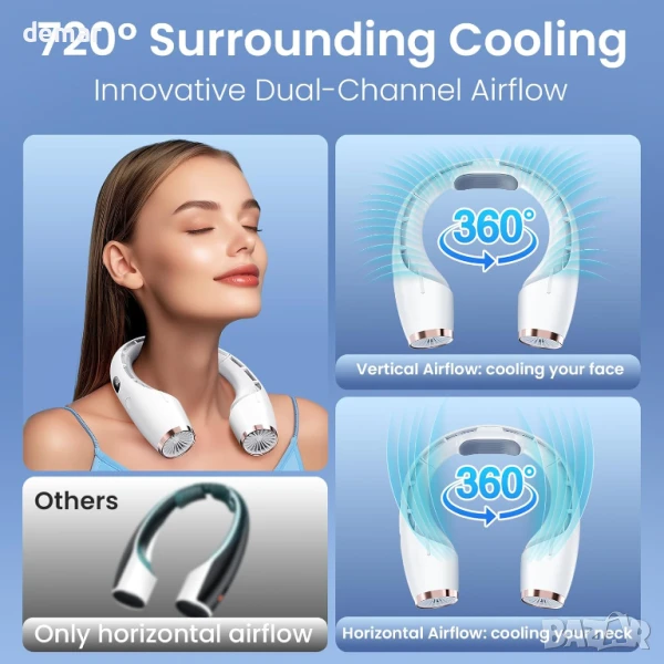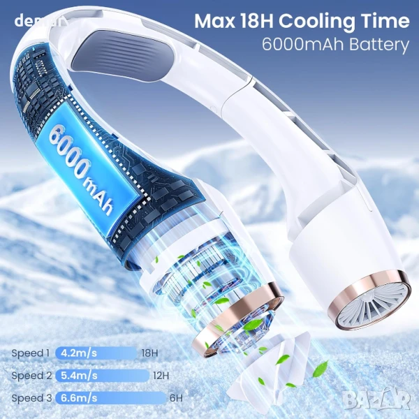 Този вентилатор за врата без лопатки осигурява бързо охлаждане с двойни канали за въздушен поток и двойни турбо мотори, предлагайки до 5 пъти по-бързо охлаждане от стандартните вентилатори. Работи до 18 часа с пълно зареждане, с LED дисплей, показващ батерията и скоростта. Проектиран за комфорт, той е с нисък шум (25dB), мека силиконова опора за врата и въздухозаборник против заплитане. С три настройки на скоростта и дизайн със свободни ръце, подобен на слушалки, той е идеален за пътуване до работа, упражнения или релакс. Безопасен и практичен за всички възрасти, той е подходящ за различни ситуации - от работа до пътуване.
