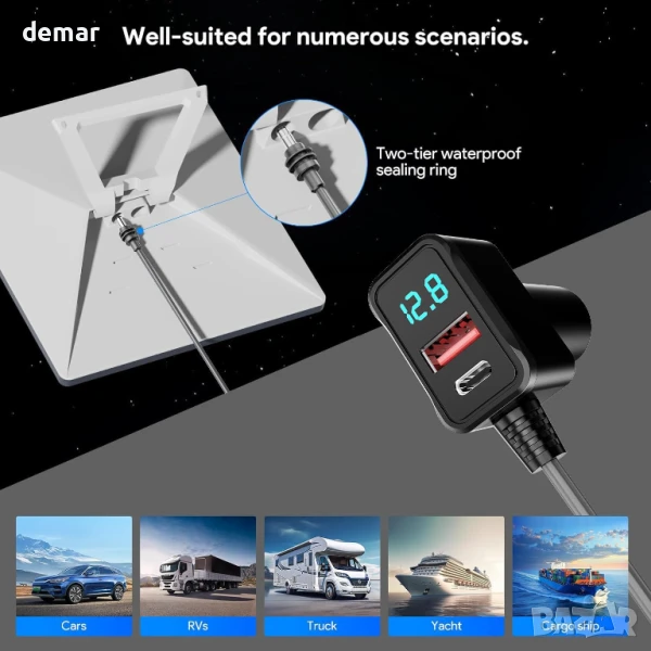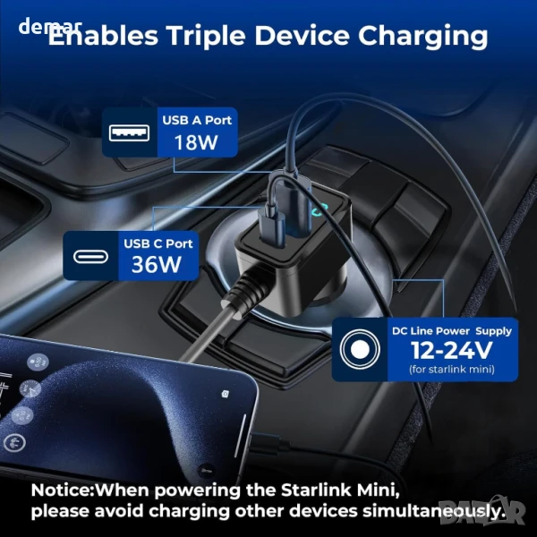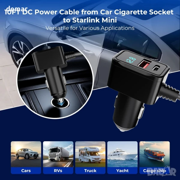 Специално проектиран за употреба със Starlink Mini в превозни средства, този захранващ кабел осигурява стабилно захранване 12.8V–24V и разполага със специален DC щепсел за предотвратяване на повреди. Той включва издръжлив, огнеупорен и устойчив на атмосферни влияния екраниран кабел 20AWG за надеждна употреба в тежки условия. Вграден цифров дисплей следи напрежението в реално време, за да осигури безопасна работа. Двойните портове – USB-C PD 36W и USB-A QC 18W – позволяват зареждане на други устройства, когато Starlink Mini не се използва, поддържайки разнообразни нужди от захранване по време на пътуване.