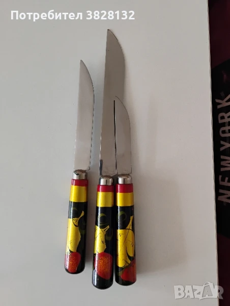 Комплект от 3 ножа, от 80-те години, СССР, неръждавейка, ръчно рисувани дръжки, неизползвани. Цената е за трите ножа.