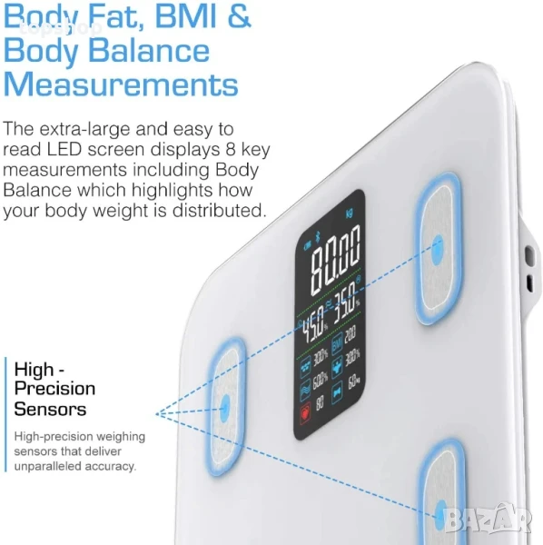 Високопрецизно измерване: Проектиран с 8 високотехнологични сензора за тегло и състав с точност от 0,1 кг. Изберете от 3 мерни единици: st / kg / lb с максимално тегло от 28 stone / 180 kg / 400 lb.
