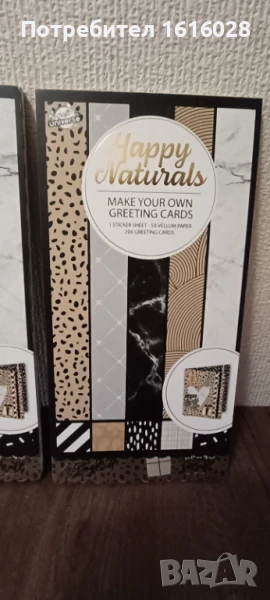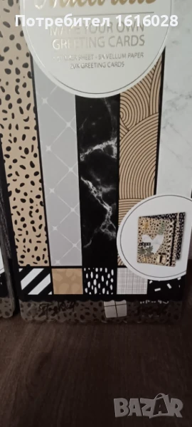 Тези два комплекта са с твърди картони за изработка на 20 поздравителни картички.В единия край са със заоблени краища,има по 1 лист със стикери,и 5 листа пергаментна разноцветна хартия.