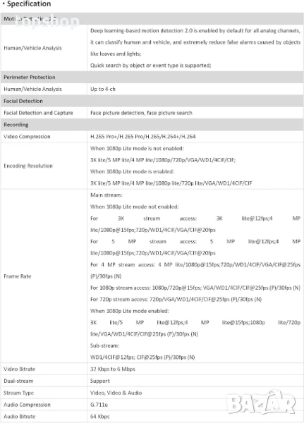 Acusense Technology: DVR разполага с Acusense Technology Motion Intelligence 2.0 за откриване на движение на хора/превозни средства за всички аналогови канали. Конфигурируем за непрекъснат 24/7 видео и аудио запис или запис на движение