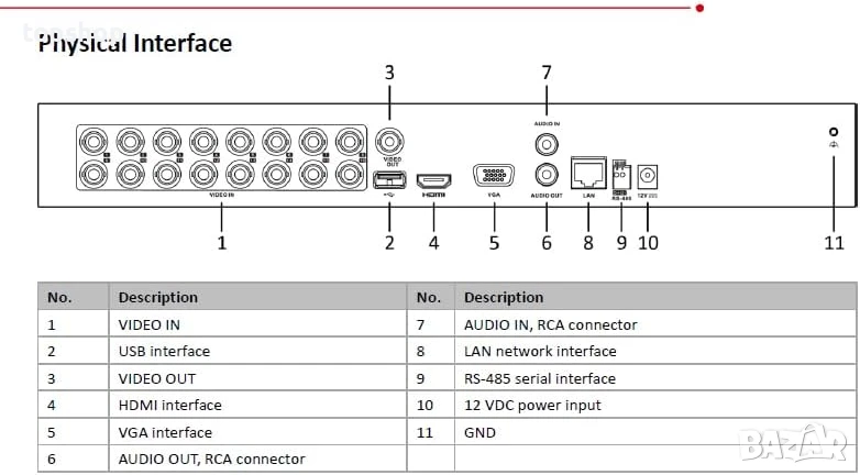 High Definition DVR, който поддържа 8-канален BNC видео вход за HD аналогови камери с резолюция до 5MP. Аудиото се предава по коаксиален кабел във всички аналогови канали. Видеото и аудиото могат да се предават по един и същ коаксиален кабел за HD-TVI камери. Няма аудио поддръжка за AHD/CVI камери.