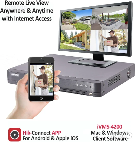 Безплатно мобилно приложение позволява отдалечен достъп от всяко място, осигурявайки преглед на живо и възпроизвеждане с безплатното мобилно приложение (Hik-Connect) за Android и iPhone и iVMS-4200 за PC клиент.