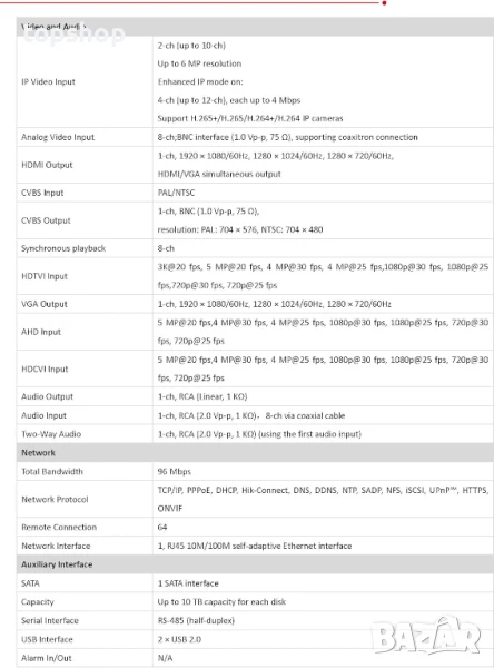- Поддържа 8 HD-TVI/AHD/CVI, аналогови или IP камери в произволна комбинация + 4 IP камери (до 6.0Mpx) в режим “Enhanced IP mode” и изключен VCA алгоритъм за инт. ф-ции;
