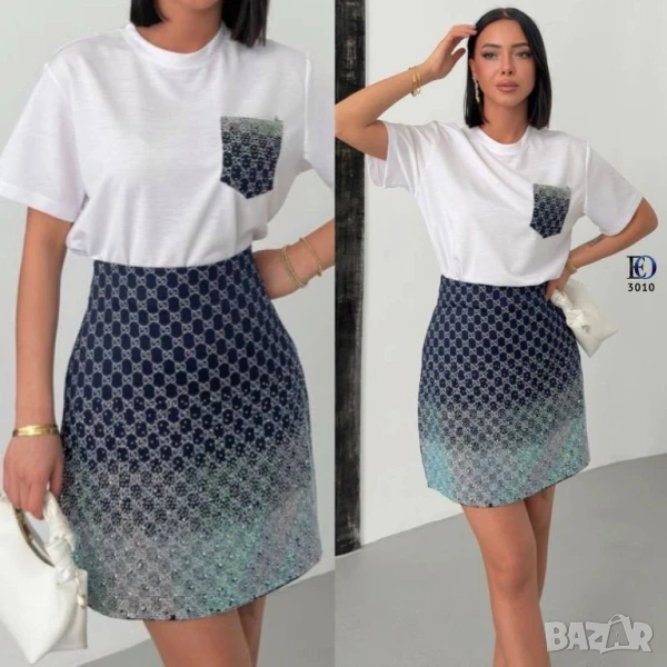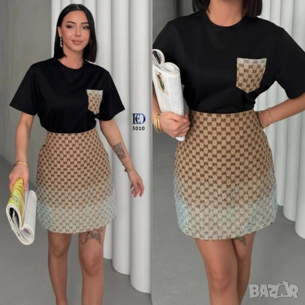 дамски комплекти с камъни тениска и пола gucci