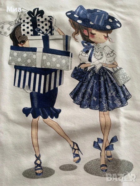 2. Бяла тениска с къс ръкав с апликация две момиченца, размер 104см/ 4 годинки, цен 15лв